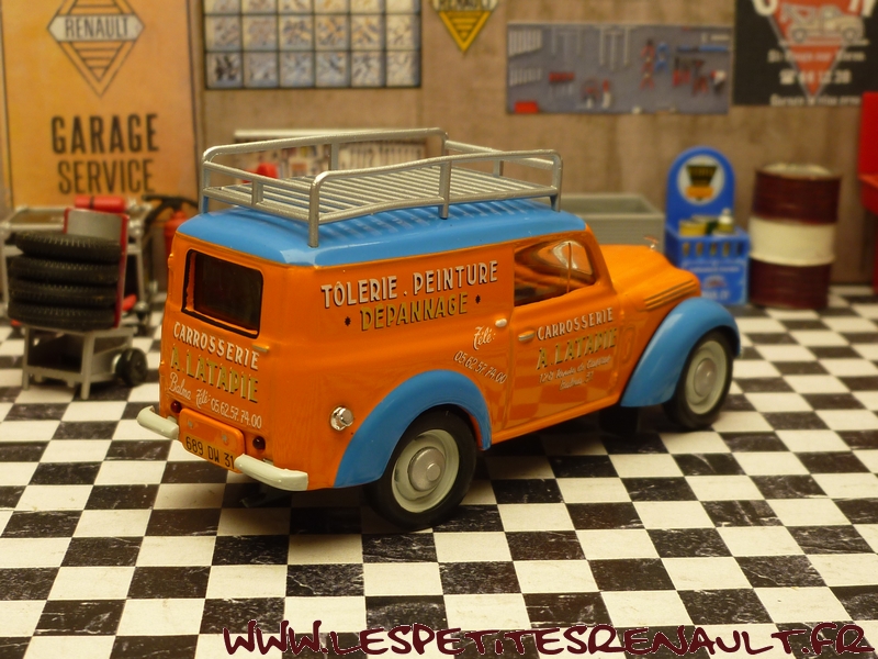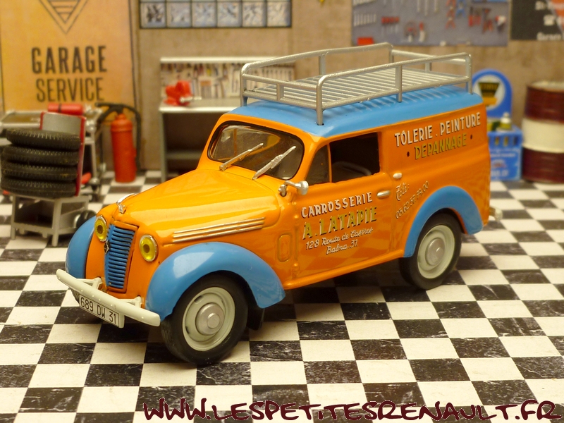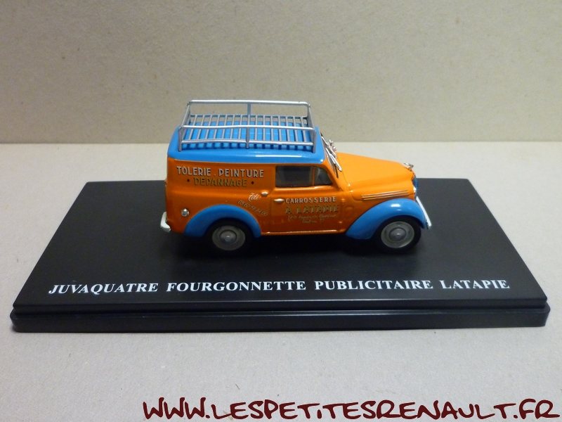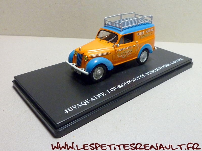 Modèle : Dauphinoise tôlée Année : 1956 Couleur : Orange et bleue Echelle : 1/43 Fabricant : Ixo Référence : 36 Collection : Utilitaires Renault (Hachette) Matière : Zamak, châssis plastique Série limitée : Non Boitage : Socle + blister Commentaires : Décoration aux couleurs de la carrosserie Latapie. L'original est une Juvaquatre mais la caisse utilisée pour la miniature par Ixo est une Dauphinoise. |