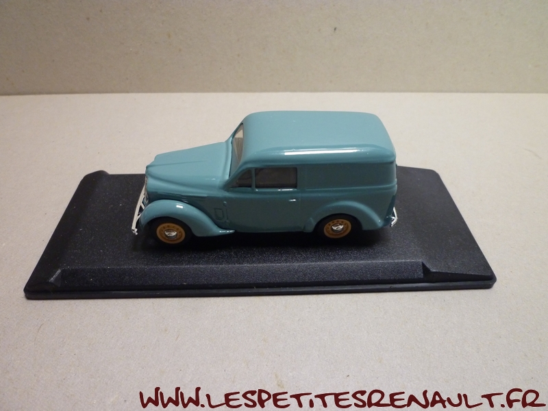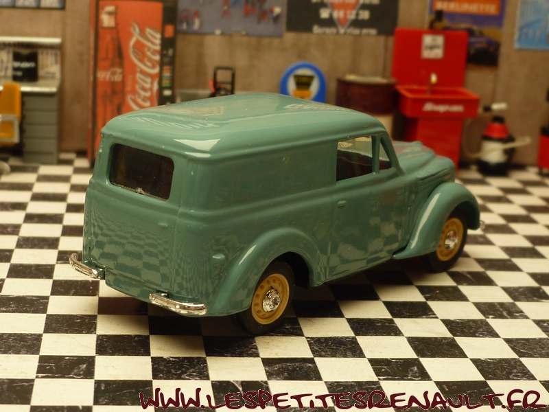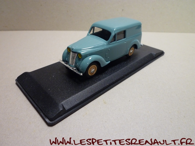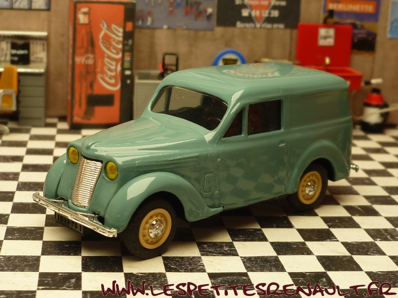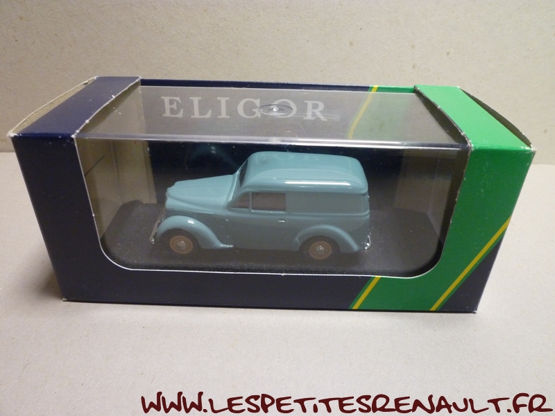 Modèle : Dauphinoise tôlée Année : 1956 Couleur : Verte Echelle : 1/43 Fabricant : Eligor Référence : 100643 Collection : Non Matière : Zamak, châssis plastique Série limitée : Non Boitage : Boite cristal + surboite Commentaires : Modèle annoncé comme étant une Juvaquatre par Eligor, mais il s'agit d'une carrosserie de Dauphinoise avec une calandre sans logo Renault et des roues artillerie de Juvaquatre. Couleur gris-vert proche du RAL6021 (Vert pâle) |