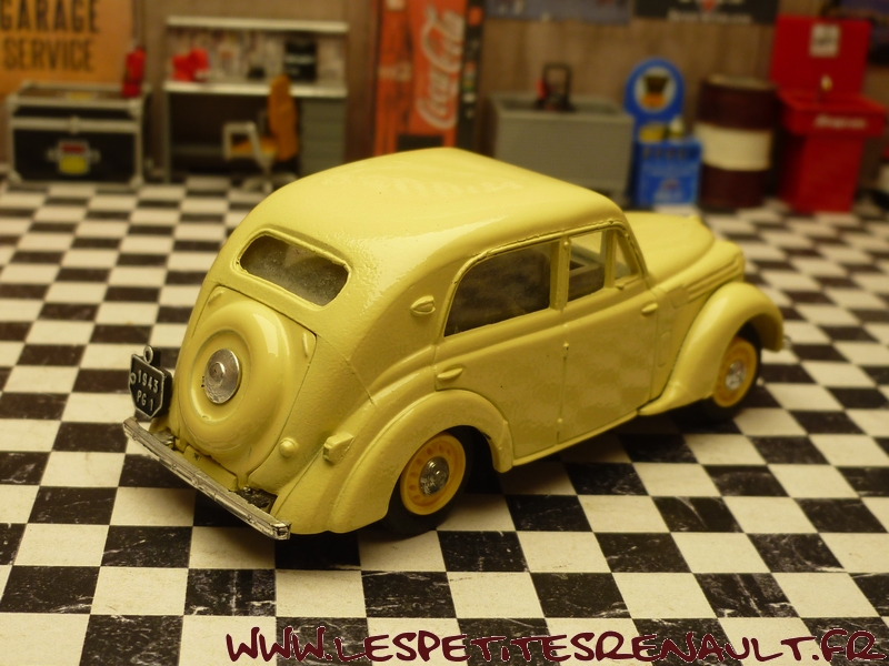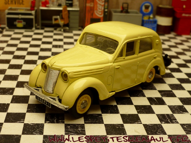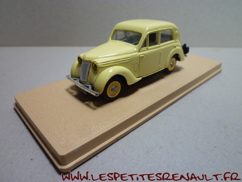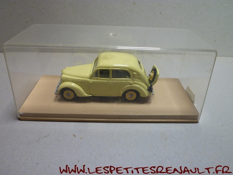 Modèle : Juvaquatre berline type BFK3 Année : 1943 Couleur : Jaune clair Echelle : 1/43 Fabricant : Eligor Référence : 1014 Collection : Non Matière : Zamak, châssis plastique Série limitée : Non Boitage : Boite cristal Commentaires : Miniature comme étant un modèle 1938, plaques marquées 1943, mais le coffre ouvrant n'est apparu qu'en 1940, donc type BFK3. |