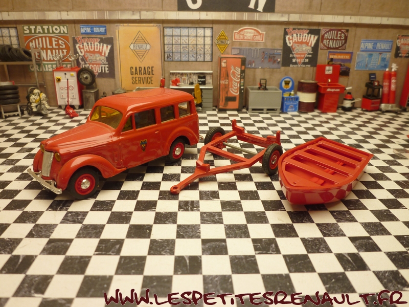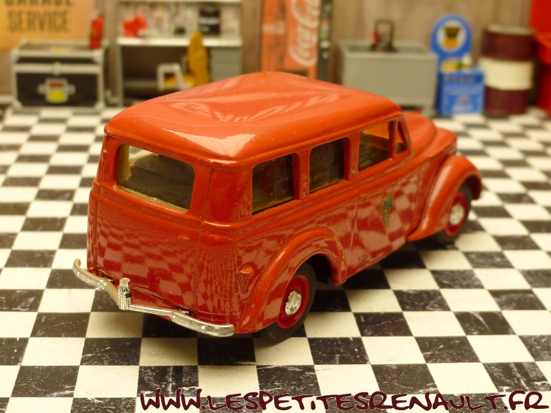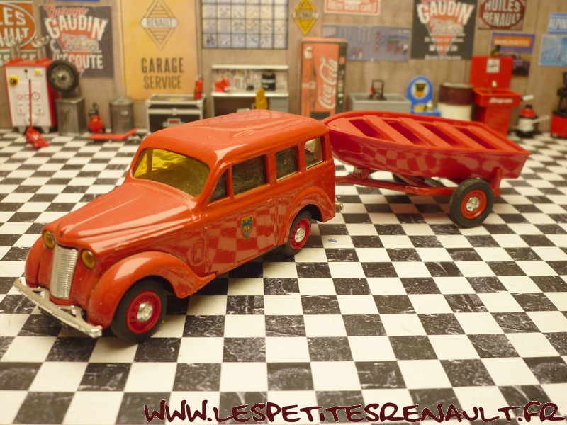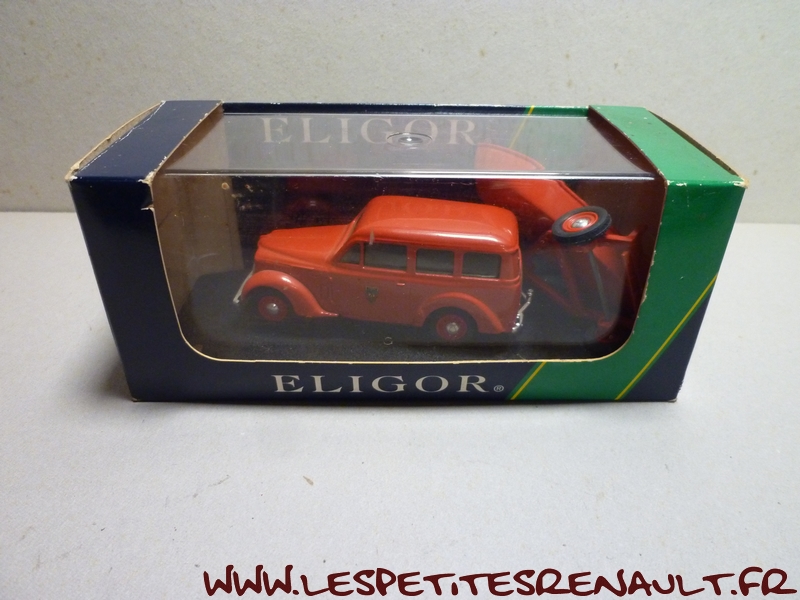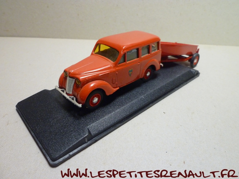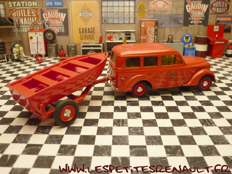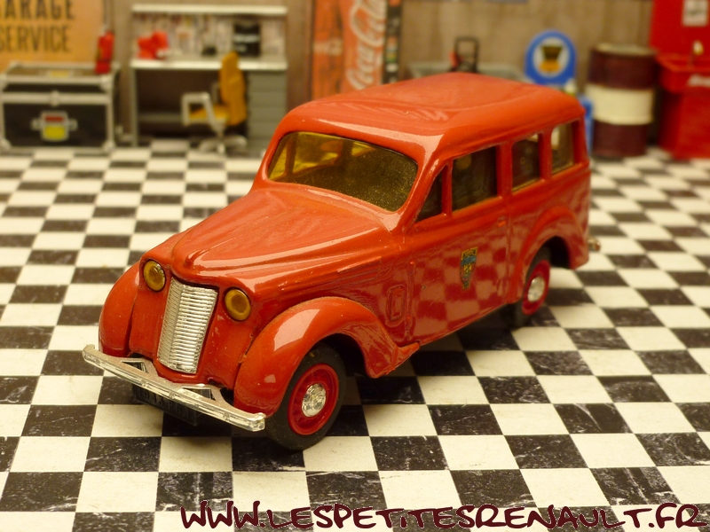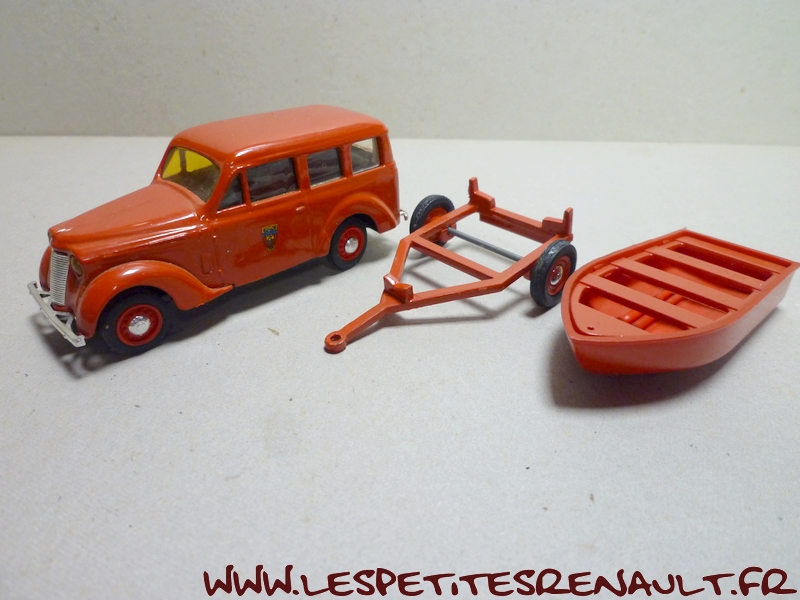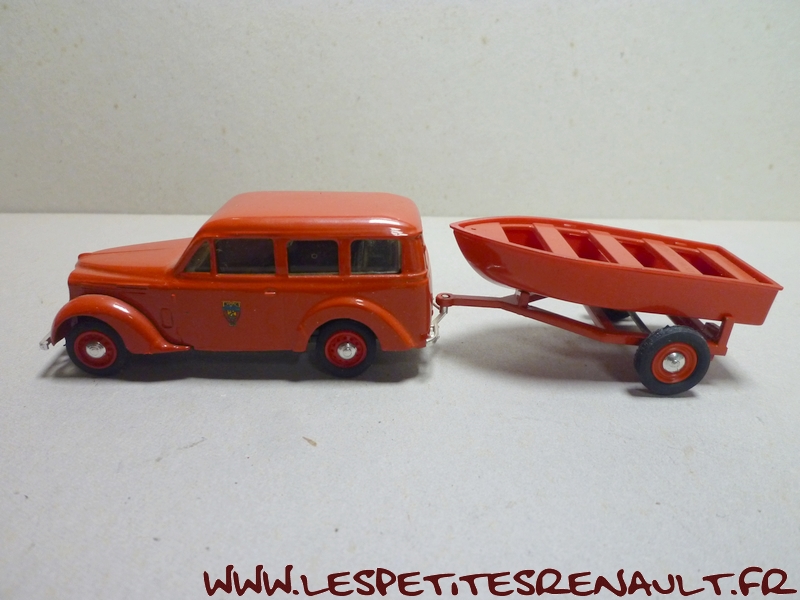 Modèle : Dauphinoise vitrée Année : 1956 Couleur : Rouge Echelle : 1/43 Fabricant : Eligor Référence : 100703 Collection : Non Matière : Zamak, châssis plastique Série limitée : Non Boitage : Boite cristal + surboite Commentaires : Modèle indiqué comme Juvaquatre, mais avec une caisse de Dauphinoise. Décoration aux couleurs des sapeurs pompiers. Livrée avec une remorque, une barque et deux rames. |