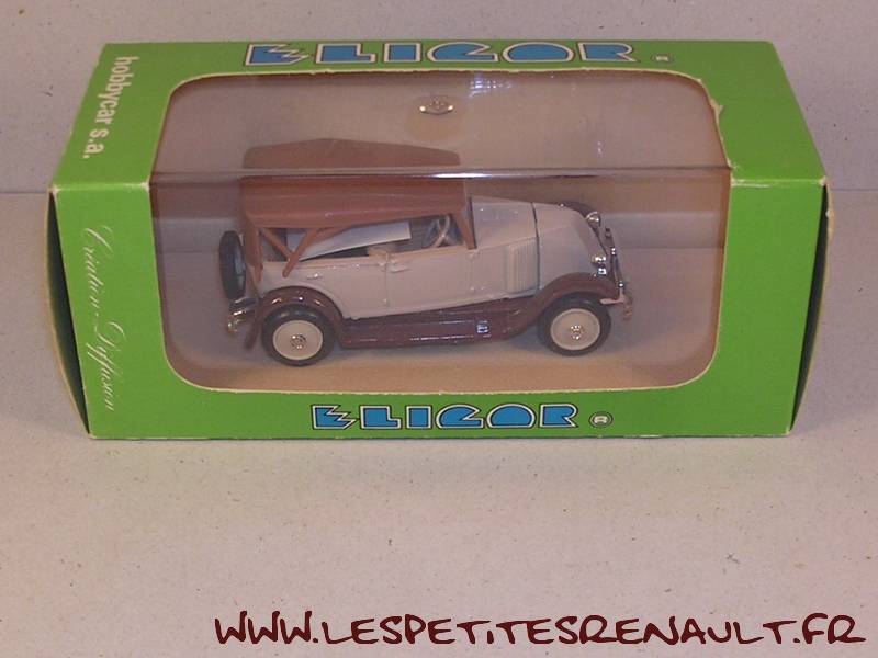 Modèle : NN2 Torpedo Année : 1929 Couleur : Beige et marron Echelle : 1/43 Fabricant : Eligor Référence : 1040 Collection : Non Matière :Zamak, châssis plastique Série limitée : Non Boitage : Boite cristal 6x15 surboite Eligor Commentaires : Issue de l'outillage Norev Modèle indiqué comme [Torpédo NN 1927] mais la présence du pare-chocs doubles et les ailes galbées en font un type NN2 de 1929. Version capotée avec ailes noires, caisse bleu marine et capote noire Modèle épuisé en 1983 et ré-éditée en 1998 sous la référence 100076 |