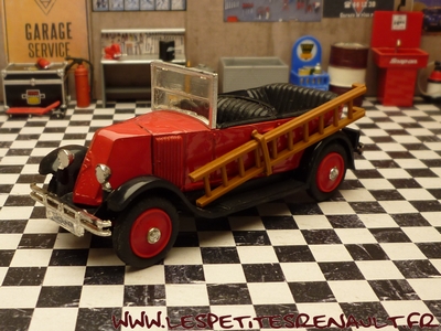 Modèle : NN2 Torpédo Année : 1929 Couleur : Rouge Echelle : 1/43 Fabricant : Eligor Référence : 100702 Collection : Non Matière :Zamak, châssis plastique Série limitée : Non Boitage : Boite cristal 8x15 Commentaires : Version torpédo décapotée Pompiers avec une échelle sur le côté Modèle indiqué comme [Torpédo NN 1927] mais la présence du pare-chocs doubles et les ailes galbées en font un type NN2 de 1929. |