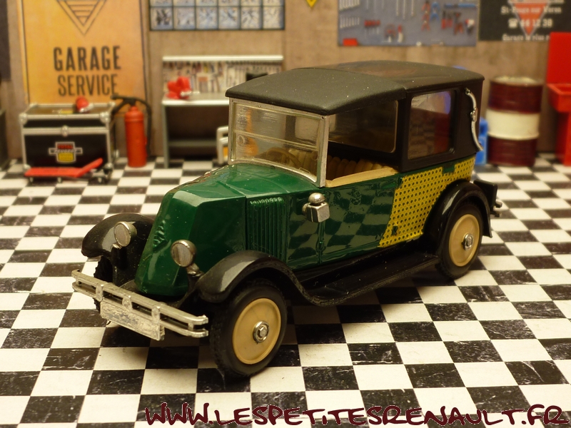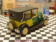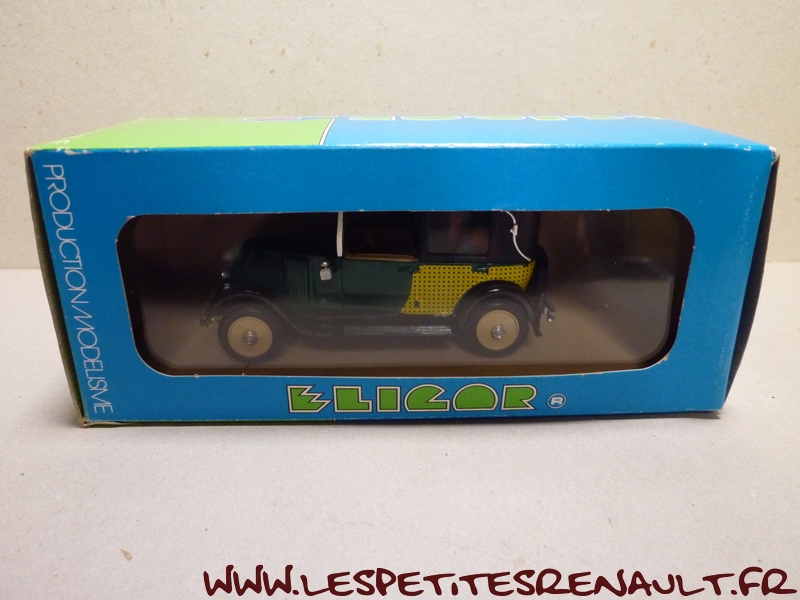 Modèle : NN Coupé de Ville Année : 1927 Couleur : Noir, vert cannage jaune Echelle : 1/43 Fabricant : Eligor Référence : 1041B Collection : N/A Matière :Zamak, châssis plastique Série limitée : Non Boitage : Boite cristal 6x15, surboite Eligor Commentaires : Présentée par Eligor comme un KZ coupé chauffeur 1928 (aussi appelé Coupé de Ville). Le modèle de base utilisé par Eligor avec la présence du pare-chocs doubles et les ailes galbées en font un type NN2 de 1929, Coupé de Ville couvert. Version couverte avec ailes noires, caisse verte avec cannage jaune et capote noire |