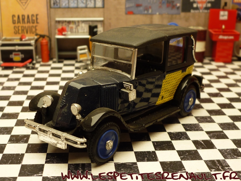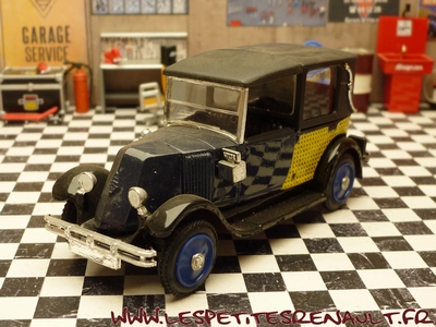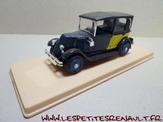 Modèle : NN2 Taxi Année : 1929 Couleur : Noir, bleu marine cannage jaune Echelle : 1/43 Fabricant : Eligor Référence : 1042 Collection : N/A Matière :Zamak, châssis plastique Série limitée : Non Boitage : Boite cristal 6x15, surboite Eligor Commentaires : Version taxi parisien Modèle indiqué comme Type NN 1927 mais la présence du pare-chocs doubles et les ailes galbées en font un type NN2 de 1929. Version couverte avec ailes noire caisse bleu marine avec cannage jaune et capote noire |