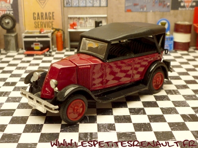 Modèle : NN2 Torpedo Année : 1929 Couleur : Bordeaux et noire Echelle : 1/43 Fabricant : Eligor Référence : 1040 Collection : Non Matière :Zamak, châssis plastique Série limitée : Non Boitage : Boite cristal 6x15, surboite Eligor Commentaires : Reprise du moule Norev Modèle indiqué comme [Torpédo NN 1927] mais la présence du pare-chocs doubles et les ailes galbées en font un type NN2 de 1929. Version capotée avec ailes noires, caisse jaune et capote noire Modèle épuisé en 1983 et ré-éditée en 1998 sous la référence 100076 Présence d'une immatriculation non posée 208 RF 6 |