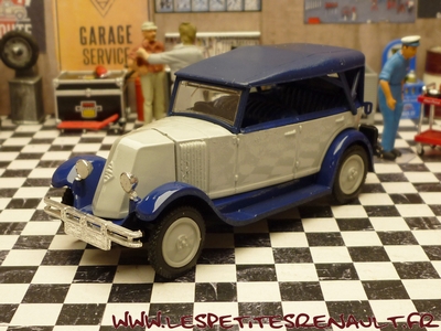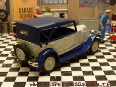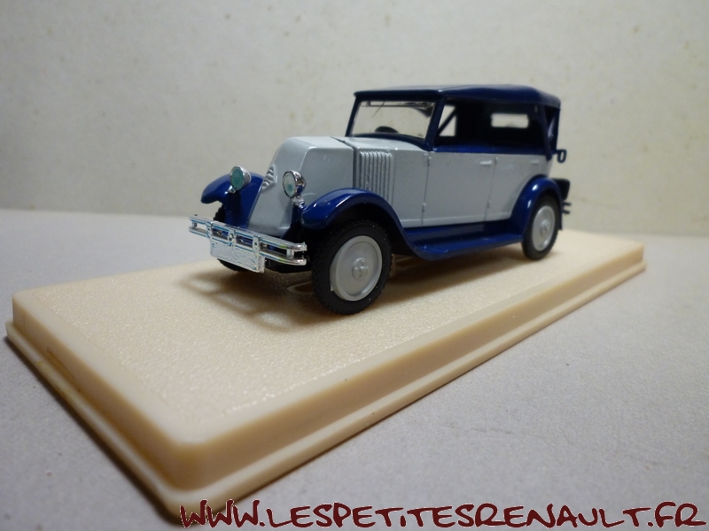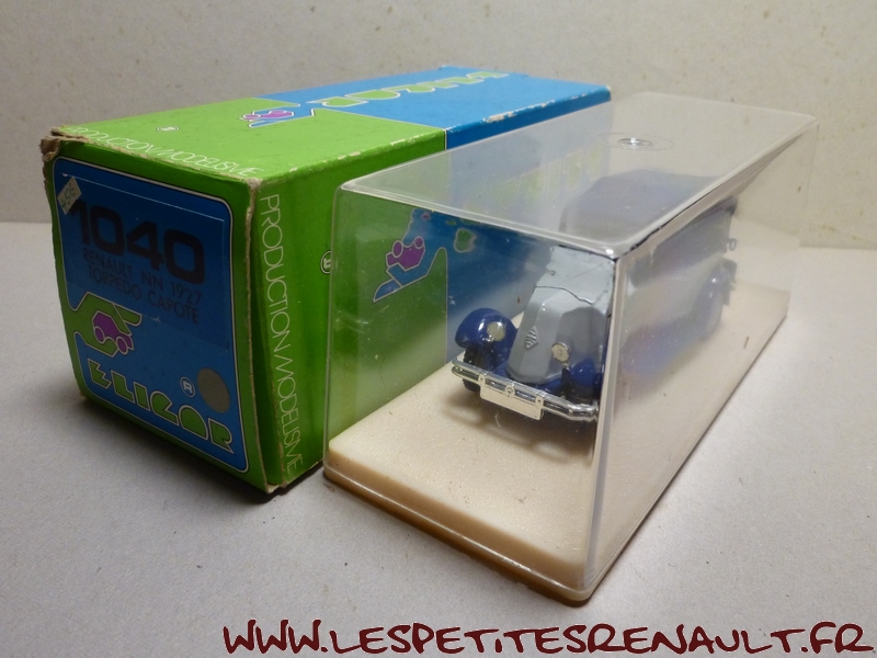 Modèle : NN2 Torpedo Année : 1929 Couleur : Bleu marine et bleu ciel Echelle : 1/43 Fabricant : Eligor Référence : 1040 Collection : Non Matière :Zamak, châssis plastique Série limitée : Non Boitage : Boite cristal 6x15, surboite Eligor Commentaires : Issue de l'outillage Norev Modèle indiqué comme [Torpédo NN 1927] mais la présence du pare-chocs doubles et les ailes galbées en font un type NN2 de 1929. Version capotée avec ailes bleue marines, caisse bleu ciel et capote bleue marine |