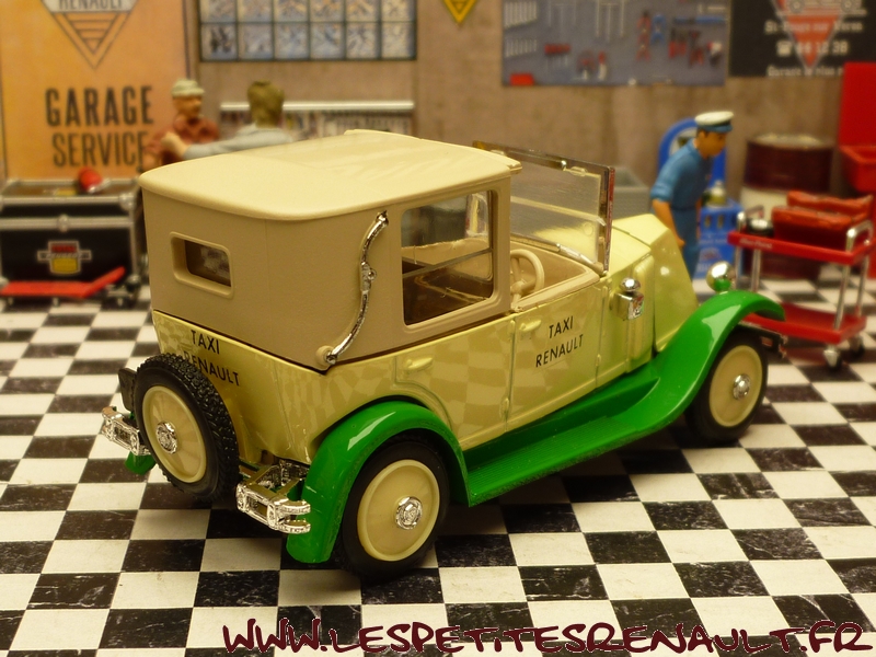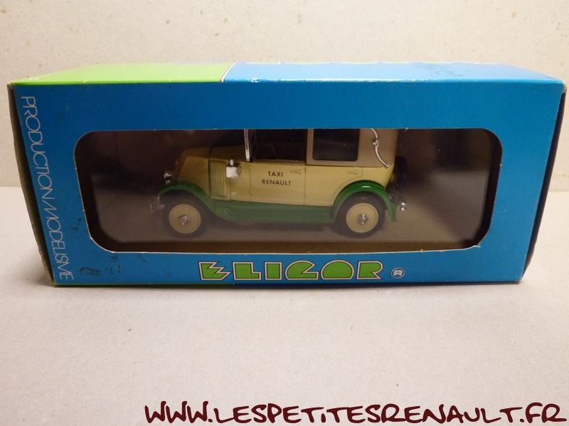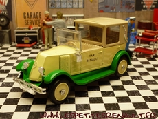 Modèle : NN2 Taxi Année : 1929 Couleur : Vert pâle et vert Echelle : 1/43 Fabricant : Eligor Référence : 1042D Collection : Non Matière :Zamak, châssis plastique Série limitée : Non Boitage : Boite cristal 6x15, surboite Eligor Commentaires : Version découverte au niveau du chauffeur avec roues vert pâles, ailes vertes, caisse vert pâle et capote beige Modèle indiqué sur la boite comme Renault KZ 1928 – C° des Taxis Parisiens. La présence du pare-chocs doubles et les ailes galbées en font un type NN2 de 1929. |