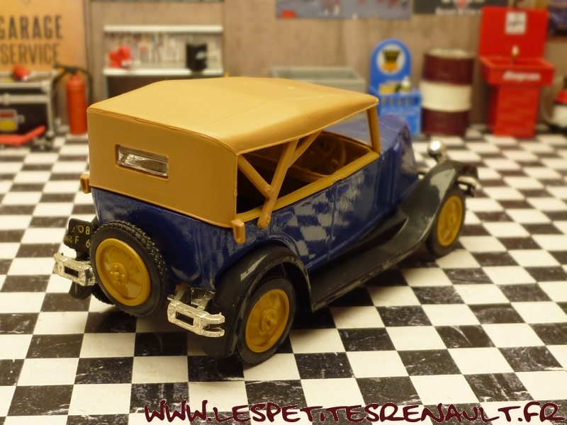 Modèle : NN2 Torpédo Année : 1929 Couleur : Bleu et beige foncé Echelle : 1/43 Fabricant : Eligor Référence : 1041 Collection : N/A Matière :Zamak, châssis plastique Série limitée : Non Boitage : Boite cristal 6x15 Commentaires : Version torpédo capoté Modèle indiqué comme [Torpédo NN 1927] mais la présence du pare-chocs doubles et les ailes galbées en font un type NN2 de 1929. Version avec ailes noires, caisse bleue marine et capote beige foncée |