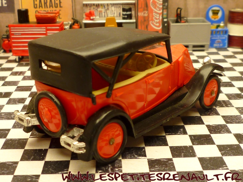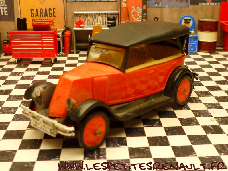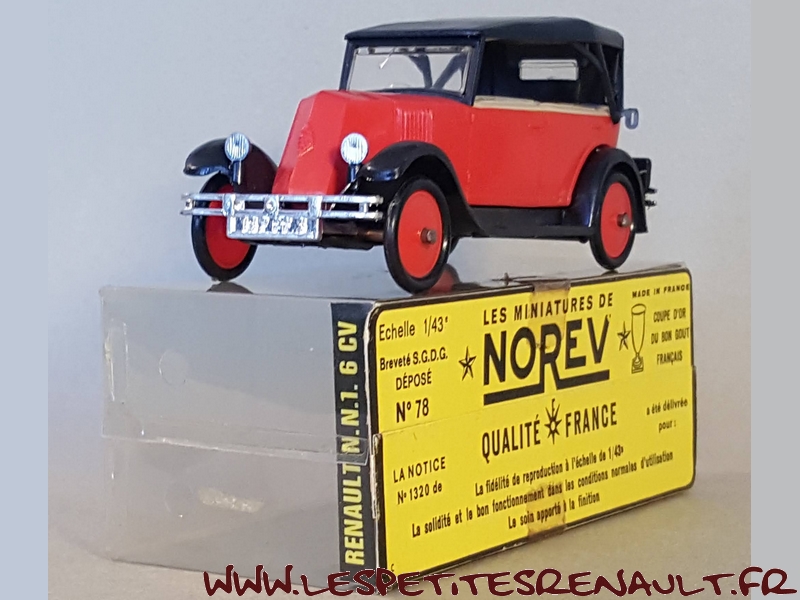 Modèle : NN2 Torpedo Année : 1928 Couleur : Rouge et noire Echelle : 1/43 Fabricant : Norev Référence : 78 Collection : Non Matière : Plastique Série limitée : Non Boitage : Boite plastique + socle carton Commentaires : Modèle qui servira de base pour la réalisation du moule des NN Eligor Modèle indiqué comme NN1 1928 mais la présence du pare-chocs doubles et les ailes galbées en font un type NN2. Version capotée avec ailes noires, caisse rouge, intérieur beige et capote noire |