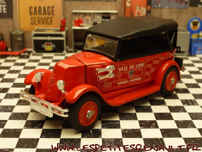 Modèle : 6cv type NN1 Torpedo Année : 1928 Couleur : Rouge Echelle : 1/43 Fabricant : Eligor Référence : 1040P Collection : Non Matière : Zamak, châssis plastique Série limitée : Non Boitage : Boite cristal + surboite Commentaires : Version Sapeurs Pompiers avec marquage latéral "Ville de Lyon - Sapeurs Pompiers". Modèle indiqué comme [NN 1927] mais un torpédo avec la présence du pare-chocs doubles et des ailes galbées en font un type NN1 (ou NN2) de 1928. Version capotée avec ailes et caisse rouge et capote noire |