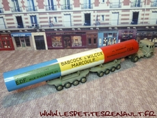 La miniature représente un tracteur mille-pattes Renault Fainéant R4180 de 120 cv modèle 1950 et sa semi-remorque porte échangeur thermique destiné à la pile atomique de Marcoule et reproduit en miniature au 1/50ème. La miniature comporte 2 remorques ainsi que la citerne de l'échangeur. Historiquement il y a eu deux convois de transport d'échangeur de pratiquement 110 tonnes chacun à destination de Marcoule. Un premier en février 1957 destiné au réacteur G3 et un second en Mars 1957 destiné au réacteur G2, les deux réacteurs étant identiques et ayant été construits en parralèlle Contrairement à ce qu'on peut lire régulièrement, il ne s'agit pas du transport d'une pile atomique, mais seulement d'un échangeur de chaleur pour la pile atomique de Marcoule. Cette pièce sert à passer la chaleur du circuit primaire (radioactive) de la centrale au circuit secondaire (non radioactif) où se trouve l'ensemble turbine-alternateur qui va transformer la chaleur en électricité. Cette pièce est aussi appelée générateur de vapeur Il s'agit ici d'un échangeur thermique pour un des UNGG prototypes du centre de Marcoule, la pile elle-même (armatures en acier et blocs de graphite pour la modération) a été montée directement sur place, sans parler des cartouches qui contenaient le combustible à l'uranium naturel. Ces circuits ont été démantelés en 1996. Dans les faits et à la différence de la miniature, ce n'est pas un Fainéant de 120cv qui tracta la pile, mais bien 2 Pacific M25/26 de 270cv chacun, ancien véhicules de l'armée américaine destinés au remorquage des chars pendant la guerre et utilisés par Bourgey Montreuil et lestés de 20 tonnes de béton pour assurer la traction D'un point de vue décoration, il a bien existé un échangeur peint en bleu, blanc et rouge, mais ce n'est ni celui du réacteur G2, ni celui du G3. Il s'agit probablement d'un des 6 autres échangeur qui furent installés par la suite sur d'autres sites. A vide, il pèse 21 tonnes. Sa vitesse maxi est de 42 km/h et il engloutit 150 litres de carburant aux 100 km. |