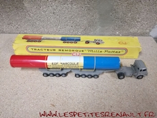 Modèle : Renault Fainéant R4180 Année : 1957 Couleur : Gris Echelle : 1/50 Fabricant : CIJ Référence : 3/75 Collection : Non Matière : Zamak, châssis tôle Série limitée : Non Boitage : Boite carton Commentaires : Reproduction du convoi Mille-Pattes qui transporta les Echangeurs depuis Paris jusqu'à Marcoule. Tracteur imaginaire, les échangeur ayant été tractés par 2 Atlantics et non par un Fainéant (voir ci-après) |