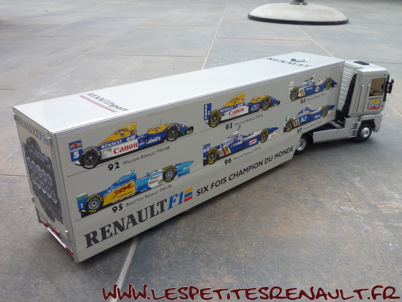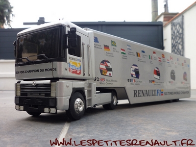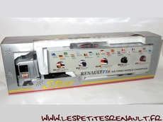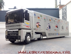 Modèle : Magnum phase 2 Année : 1997 Couleur : Gris Echelle : 1/43 Fabricant : Eligor Référence : 11245 Collection : Non Matière : Zamak, remorque ABS Série limitée : Non Boitage : Boite carton + plastique Commentaires : Décoration Assistance Renault F1 réalisée pour fêter les victoires Renault. |