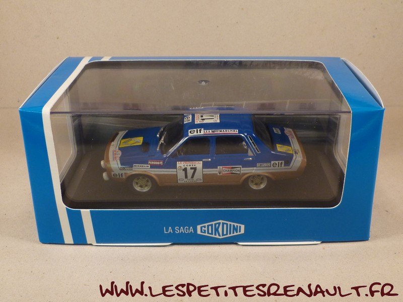 Modèle : Renault 12 Gordini Année : 1975 Course : Tour de Corse Equipage : #17 Pironi-Bonamour Couleur : Bleue et or Echelle : 1/43 Fabricant : Ixo Référence : 22 Collection : Saga Gordini (Atlas) Matière : Zamak, châssis plastique Série limitée : Non Boitage : Boite cristal + surboite carton Commentaires : Renault 12 Gordini prêtée par Jean-Claude Chervier. La voiture est engagée en groupe 2, ce modèle n'ayant jamais été homologué en groupe 1 |