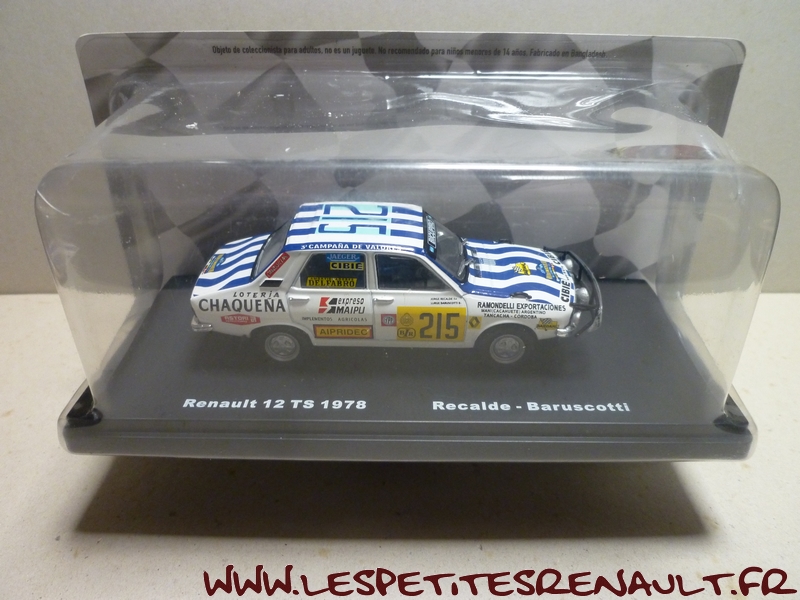 Modèle : Renault 12 TS Année : 1978 Course : Rally Vuelta a America del Sur Equipage : #215 Recalde / Baruscotti Couleur : Blanche et bleue Echelle : 1/43 Fabricant : Ixo Référence : 30 Collection : Los Mejores Coches Los Grandes Campeones - Salvat (Argentine) Matière : Zamak, châssis plastique Série limitée : Non Boitage : Socle + blister Commentaires : Vainqueur du Rallye en classe B |