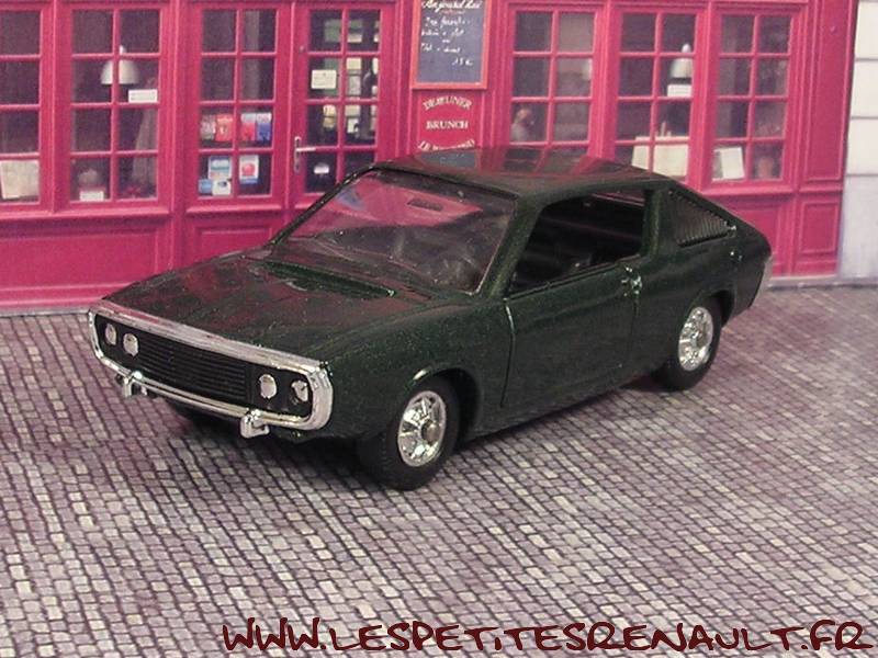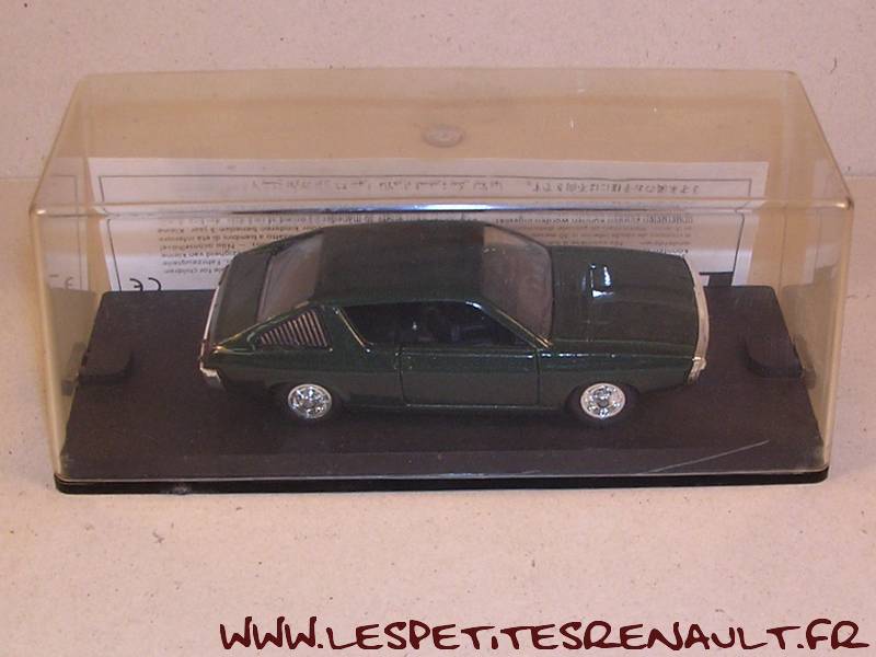 Modèle : Renault 17 TS Phase 1 Année : 1972 Couleur : Vert métallisé Echelle : 1/43 Fabricant : Verem Référence : 426 Collection : Non Matière : Zamak, châssis plastique Série limitée : Non Boitage : Boite cristal 6x15 Commentaires : Version fausse avec un capot sans bossage |