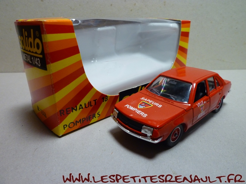 Modèle : Renault 18 berline phase 1 Année : 1980 Couleur : Rouge Echelle : 1/43 Fabricant : Solido Référence : 1318 Collection : Non Matière : Zamak, châssis plastique Série limitée : Non Boitage : Boite carton + plastique Commentaires : Décoration aux couleurs des Sapeurs Pompiers de Paris |