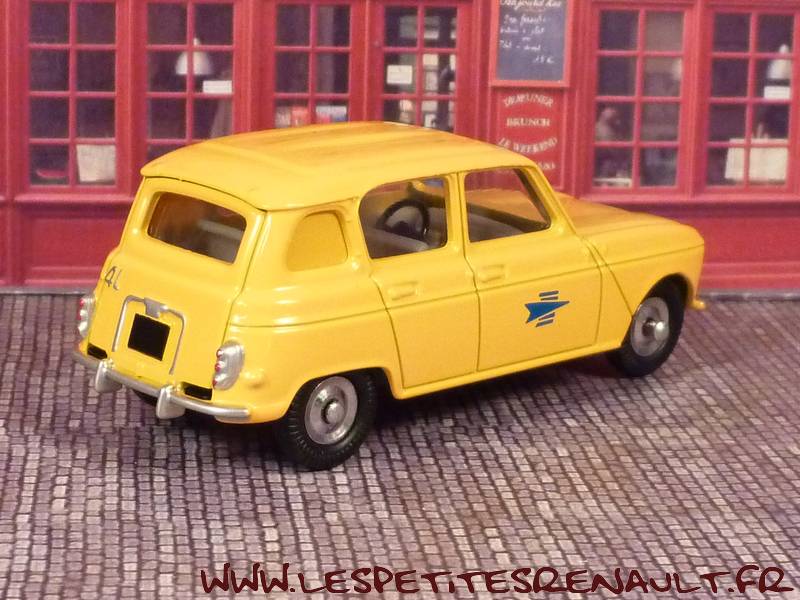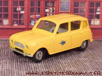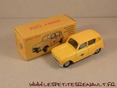 Modèle : Renault 4 LAnnée : 1964 Couleur : Jaune Fabriquant : Dinky Toys Référence : 518 P Collection : -- Matière : Zamak, châssis tôle Série limité : Non Boitage : Coffret carton Commentaires : Ré-édition. Version PTT livrée en coffret carton avec la R4 Pompiers |