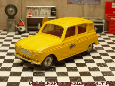 Modèle : Renault 4 berline Année : 1961 Couleur : Jaune Echelle : 1/43 Fabricant : Dinky Toys Référence : 561 Collection : Non Matière : Zamak, châssis plastique Série limitée : Non Boitage : Boite carton Commentaires : Décoration La Poste. Modèle avec custode non vitrée et capot sans nervure centrale. Défaut du moule Dinky car cela ne s'appliquait que sur les modèles de pre-série. Production DTF |