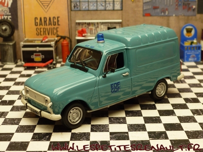 Modèle : Renault 4 F6 Année : 1980 Couleur : Bleue Echelle : 1/43 Fabricant : Norev Référence : 511052 Collection : Non Matière : Zamak, châssis plastique Série limitée : Non Boitage : Boite 8x15, surboite Norev Commentaires : Décoration EDF-GDF. En général les R4 F6 EDF-GDF étaient des modèles semi vitrés |