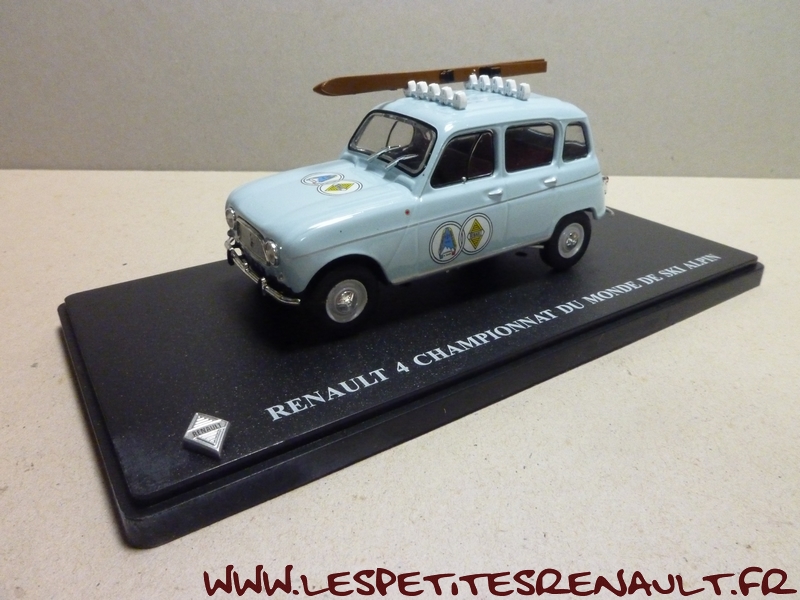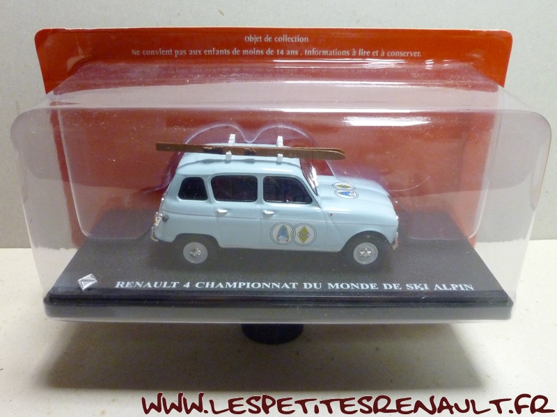 Modèle : Renault 4 L Année : 1962 Couleur : Bleu ciel Echelle : 1/43 Fabricant : Ixo Référence : 23 Collection : Passion Renault 4 (Hachette) Matière : Zamak, châssis plastique Série limitée : Non Boitage : Socle + blister Commentaires : Modèle ayant servi pour assurer le transport des skieurs pendant les championnats du monde de ski alpin à Chamonix en 1962 |