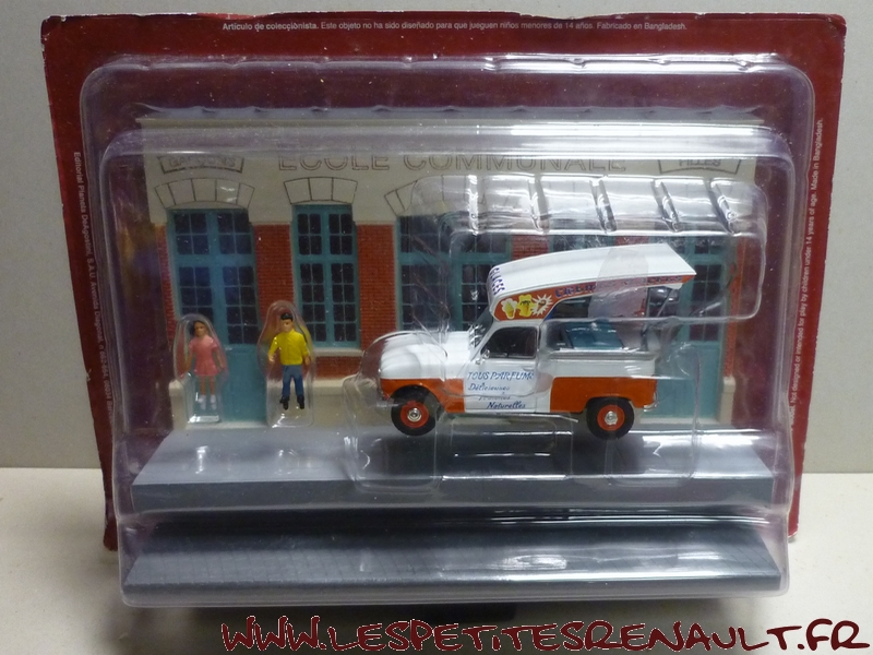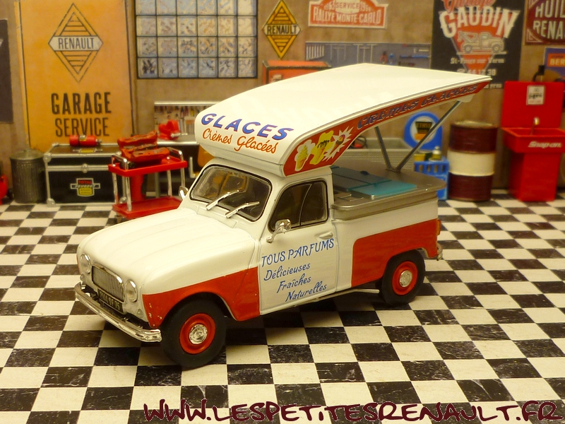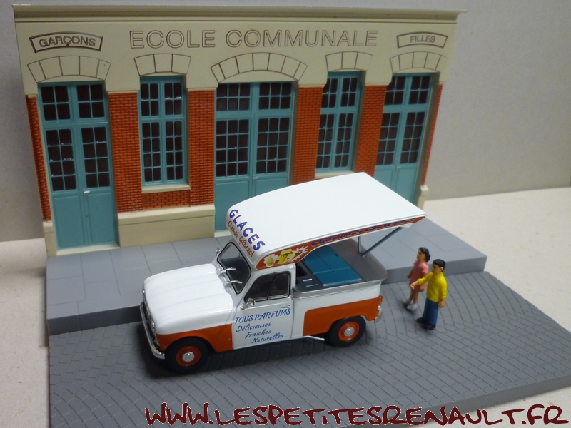 Modèle : Renault 4 Pick-up Année : 1967 Couleur : Blanche et orange Echelle : 1/43 Fabricant : Ixo Référence : 18 Collection : Véhicules utilitaires avec diorama (Altaya) Matière : Zamak, châssis plastique Série limitée : Non Boitage : Diorama + blister Commentaires : Version marchand de glaces |
