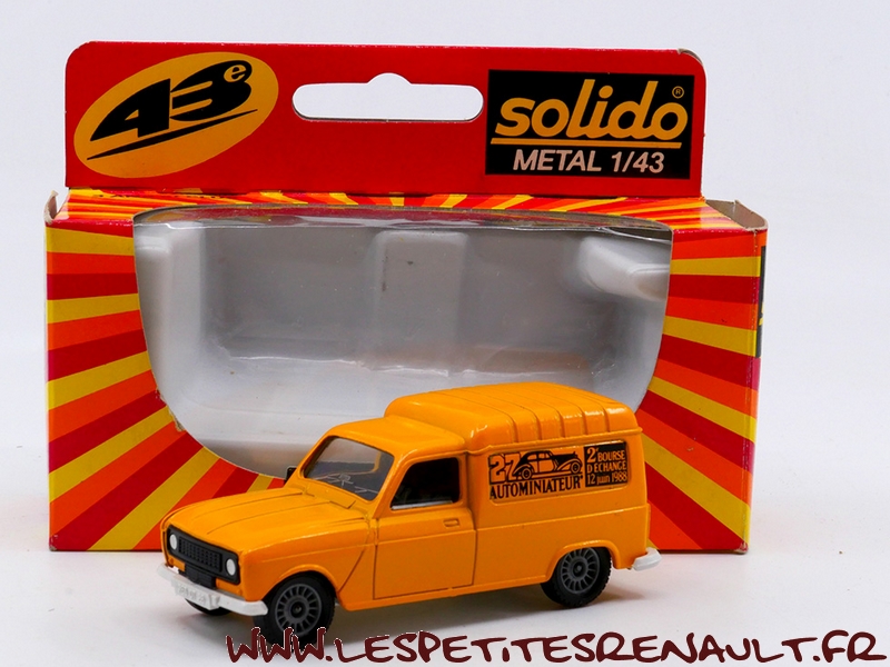 Modèle : Renault 4 F6 Année : 1983 Couleur : Jaune Echelle : 1/43 Fabricant : Solido Référence : 1325 Collection : Non Matière : Zamak, châssis plastique Série limitée : Oui Boitage : Boite carton + plastique Commentaires : Modèle proposé lors de la 2eme bourse d'échanges Autominiateur le 12 juin 1988 |