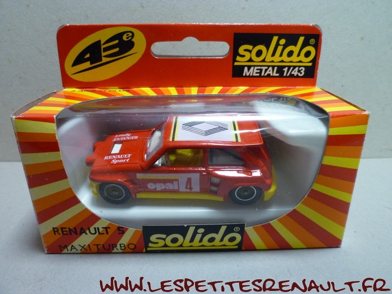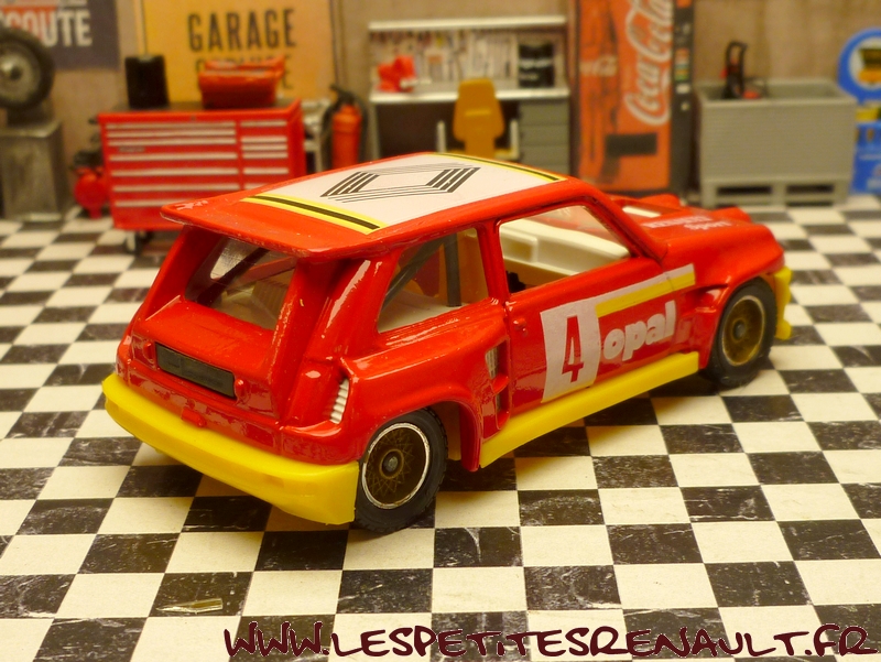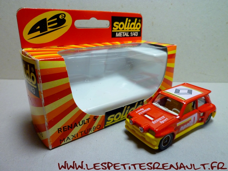 Modèle : Renault 5 Maxi Turbo Année : 1986 Course : Rallye Equipage : #4 Couleur : Rouge Echelle : 1/43 Fabricant : Solido Référence : 1353 Collection : Non Matière : Zamak, châssis plastique Série limitée : Non Boitage : Boite carton + plastique Commentaires : Version rallye sans identification particulière. |