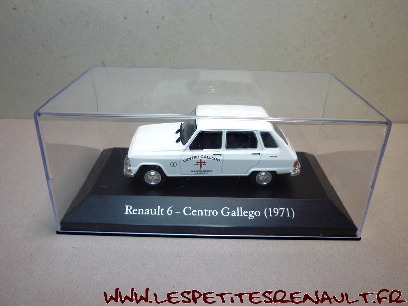 Modèle : Renault 6 phase 1 Année : 1971 Couleur : Blanche Echelle : 1/43 Fabricant : Ixo Référence : 47 Collection : Vehiculos Inolvidables de Reparto y Servicio Argentinos (Salvat) Matière : Zamak, châssis plastique Série limitée : Non Boitage : Boite cristal 7x15 Commentaires : Version Centro Gallego, service de soins à domicile. Hayon arrière badgé Ika-Renault |