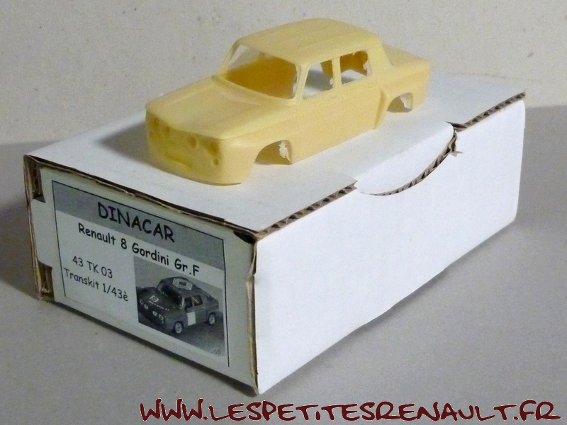 Modèle : Renault 8 Gordini 1300 Année : 1968 Course : Championnat Groupe F Equipage : Indéterminé Couleur : Bleue Echelle : 1/43 Fabricant : Dinacar Référence : 43TK03 Collection : Non Matière : Résine Série limitée : Non Boitage : Boite carton Commentaires : Transkit artisanal non monté |