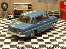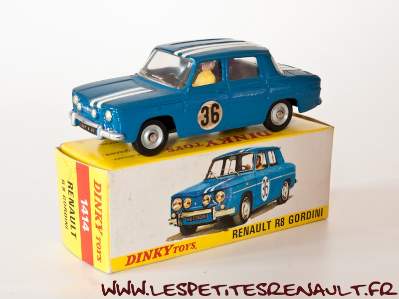 Modèle : Renault 8 Gordini Année : 1968 Couleur : Bleue Echelle : 1/43 Fabricant : Dinky Toys Référence : 1414 Collection : Non Matière : Zamak, châssis tôle Série limitée : Non Boitage : Boite carton Commentaires : Version avec vitres, intérieur et pilote |