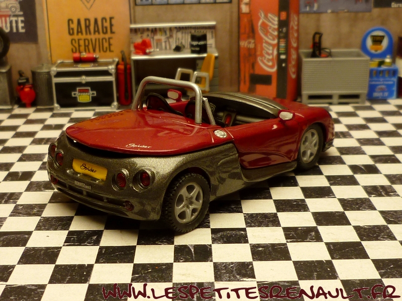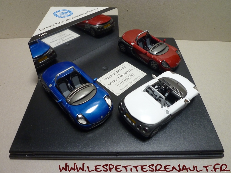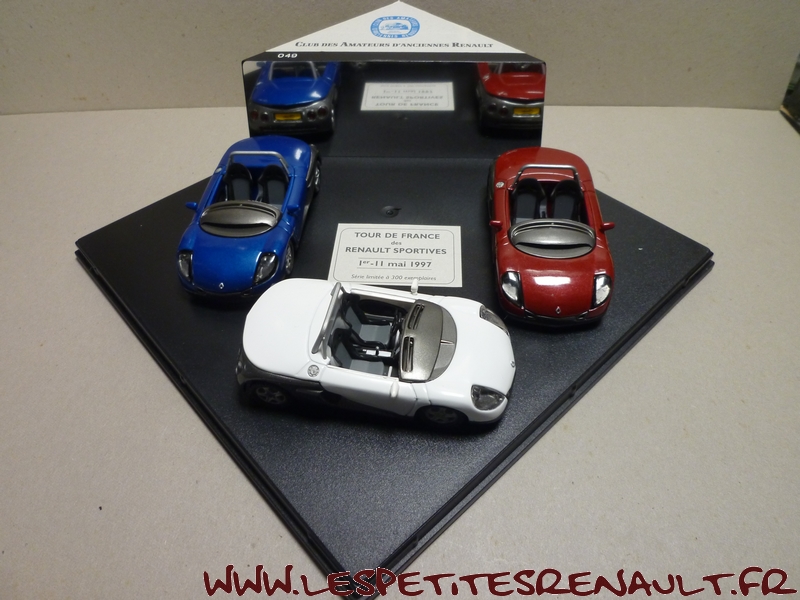 Modèle : Spider Année : 1997 Couleur : Rouge métallisé Echelle : 1/43 Fabricant : Vitesse Référence : Sans référence Collection : Non Matière : Zamak, châssis plastique Série limitée : 049/300 Boitage : Coffret cristal 19x19 Commentaires : Modèle issu du coffret réalisé pour le CAAR à l'occasion du Tour de France des Renault Sportives du 1er eu 11 mai 1997. Série limtée à 300 exemplaires |