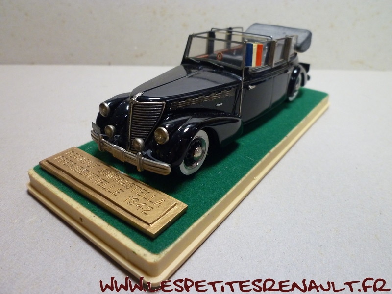 Modèle : Suprastella type BDP1 Présidentielle Année : 1943 Couleur : Noire Echelle : 1/43 Fabricant : Epokit - Belle Epoque Référence : EP061 Collection : Non Matière : Résine Série limitée : Non Boitage : Boite cristal Commentaires : Version présidentielle utilisée entre 1943 et 1950 par Pétain, Auriol, Coty et le Général de Gaulle |