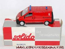 Modèle : Trafic II phase 1 tôlé Année : 2002 Couleur : Rouge Echelle : 1/50 Fabricant : Solido Référence : 71 Collection : Véhicules de sapeurs pompiers (Hachette) Matière : Zamak, châssis plastique Série limité : Non Boitage : Boite carton Commentaires : Version Sapeurs Pompiers |