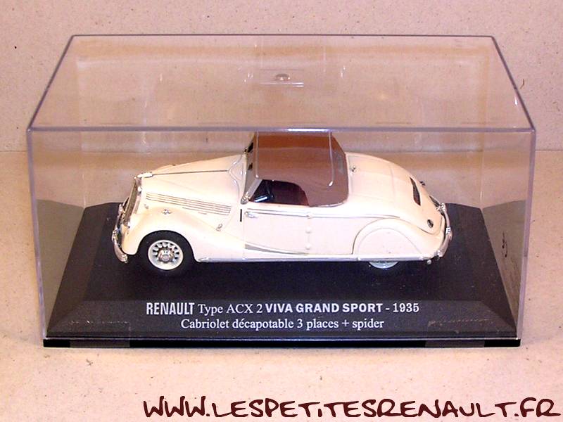 Modèle : Viva Grand Sport Année : 1935 Couleur : Beige Echelle : 1/43 Fabricant : Norev Référence : 73 Collection : Renault Collaection (M6) Matière : Zamak, châssis plastique Série limitée : Non Boitage : Boite cristal 8x15 Commentaires : Type ACX2, version cabriolet fermé |