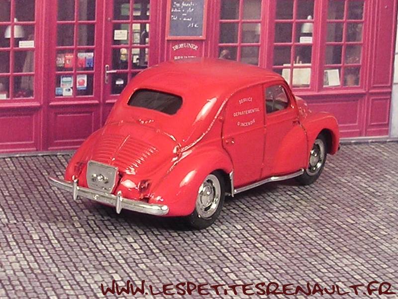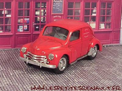Modèle : 4 cv commerciale Année : 1954 Couleur : Rouge Echelle : 1/43 Fabricant : Verem Référence : 915 (coffret) Collection : Non Matière : Zamak Série limitée : Non Boitage : Coffret carton + cristal Commentaires : Décoration Pompiers. Livré en coffret avec une Twingo et une R4 fourgonnette. Modèle anachronique. Pas de commerciales en version 3 moustaches, et aucune photo du modèle à l'échelle 1 |