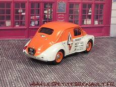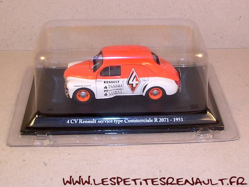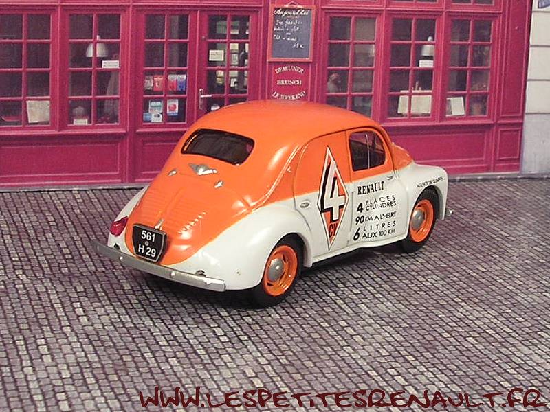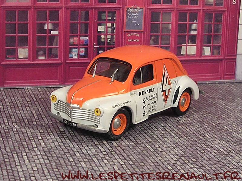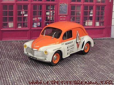 Modèle : 4 cv commerciale Année : 1951 Couleur : Orange et blanc Echelle : 1/43 Fabricant : Eligor Référence : 25 Collection : 4 cv collection (Hachette) Matière : Zamak, châssis plastique Série limitée : Non Boitage : Socle + blister Commentaires : Décoration Garage Renault Quimper. Aucune photo du modèle réel avec cette décoration |