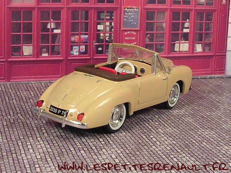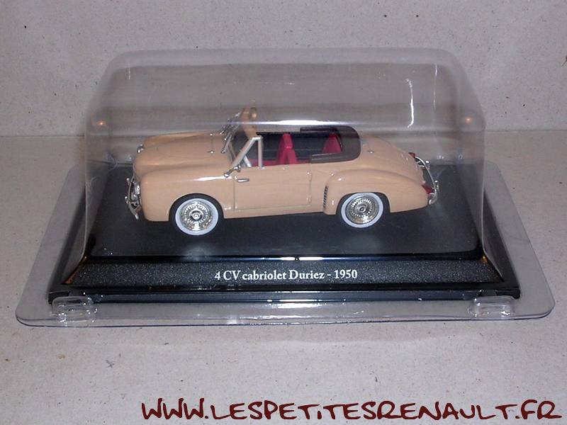 Modèle : 4 cv cabriolet Duriez Année : 1950 Couleur : Beige Echelle : 1/43 Fabricant : Eligor Référence : 33 Collection : 4 cv collection (Hachette) Matière : Zamak, châssis plastique Série limitée : Non Boitage : Socle + Blister Commentaires : Version avec capote baissée |