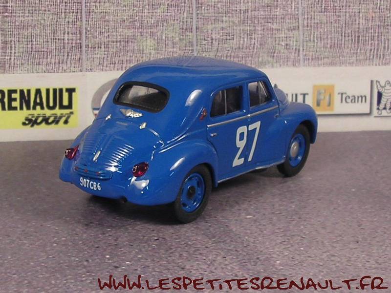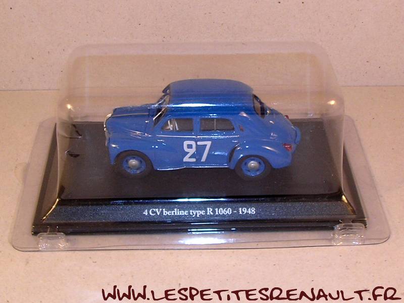 Modèle : 4 cv berline Année : 1948 Course : Course de côte du Mont Ventoux Equipage : #27- François Landon Couleur : Bleue Echelle : 1/43 Fabricant : Eligor Référence : 34 Collection : 4 cv collection (Hachette) Matière : Zamak, châssis plastique Série limitée : Non Boitage : Socle + Blister Commentaires : Type 1060. Une des 4cv à avoir pris les 5 premières places au classement |