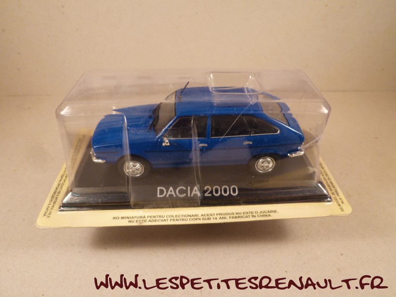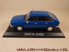 Modèle : Dacia 2000 Année : 1984 Couleur : Bleue Echelle : 1/43 Fabricant : Ixo Référence : 63 Collection : Masini de Legenda (De agostini) Matière : Zamak, châssis plastique Série limité : Non Boitage : Socle + blister Commentaires : Voiture fabriqu;ée entre 1984 et 1986 sur une base de Renault 20 pour l'élite du Parti communiste roumain, elle était assemblée en Roumanie par Dacia et peinte uniquement en noir ou en bleu foncé. |