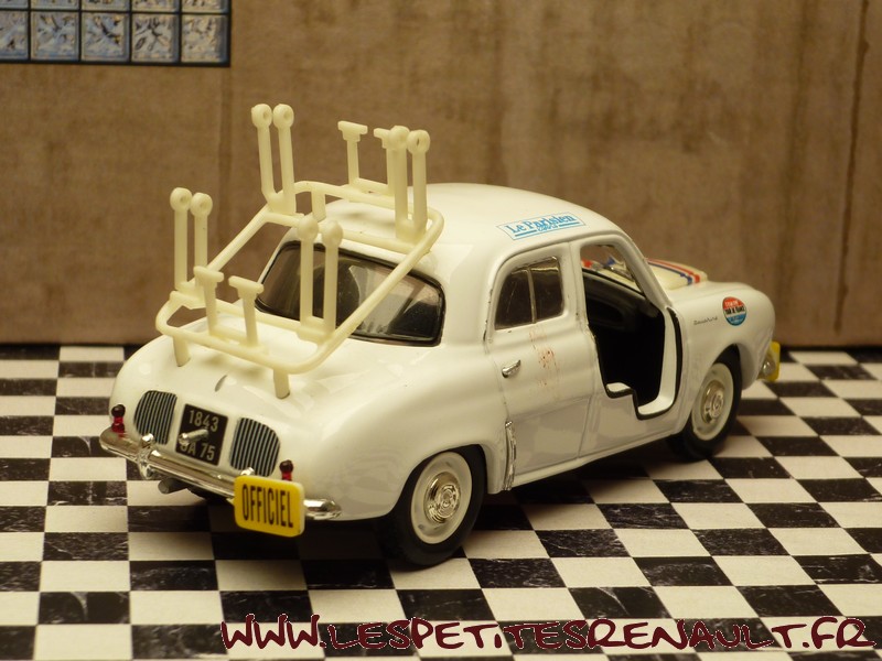 Modèle : Dauphine Année : 1959 Couleur : Blanche Echelle : 1/43 Fabricant : Norev Référence : 41 Collection : Tour de France (Atlas) Matière : Zamak, châssis plastique Série limité : Non Boitage : Blister Commentaires : Version assistance cyclistes du Tour de France 1959. La miniature utilisée n'est pas conforme car il s'agit d'un modèle 1961 (cligontants sous les optiques avant) censé représenter une voiture de 1959 |