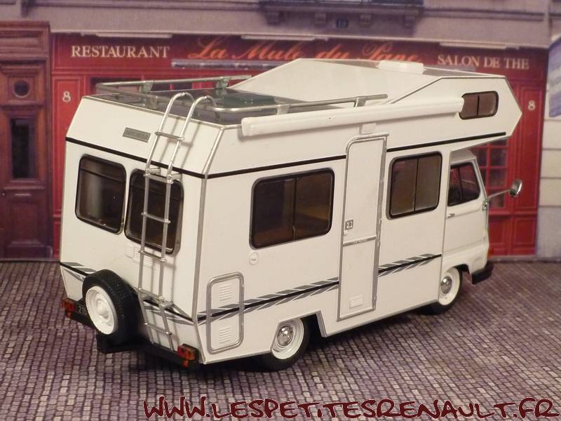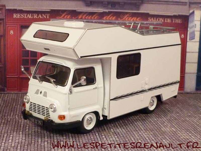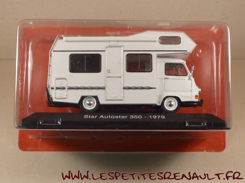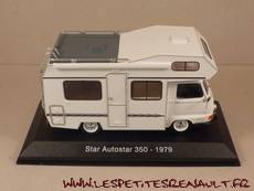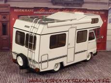 Modèle : Estafette Camping Car Année : 1979 Couleur : Blanche Echelle : 1/43 Fabricant : Ixo Référence 6 Collection : Passion Camping Car (Hachette) Matière : Zamak, et plastique Série limité : Non Boitage : Socle + Blister Commentaires : Il s'agit d'une d'un châssis d'estafette pick-up surmonté d'une cellule Autostar 350 de chez Star. |