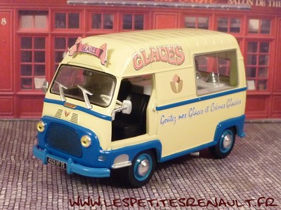 Modèle : Estafette réhaussée glacier Année : 1963 Couleur : crème et bleu Echelle : 1/43 Fabricant : Ixo Référence : 2 Collection : Utilitaires Renault (Hachette) Matière : Zamak, châssis plastique Série limité : Non Boitage : Socle + blister Commentaires : Fourgon 800kg surélevé type R2132 marchand de glace |