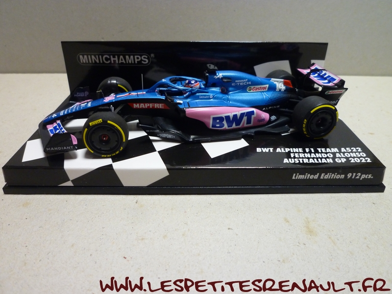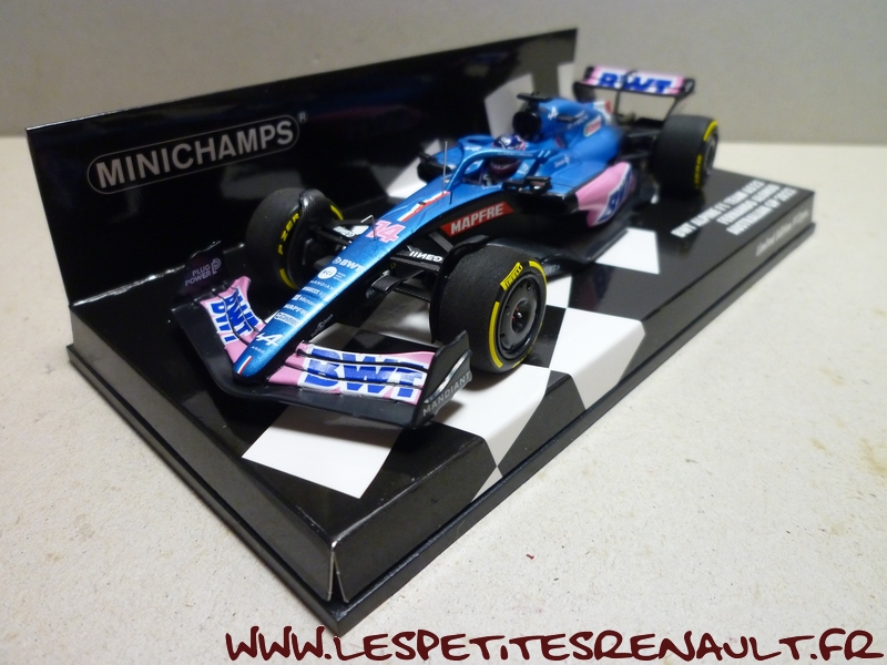 Modèle : Alpine A 522 Année : 2022 Course : Saison 2022-2023 Pilote : #14 - Fernando Alonso Couleur : Bleu métallisé Echelle : 1/43 Fabricant : Minichamps Référence : 417220314 Collection : Non Matière : Résine, châssis plastique Série limitée : 912 ex. Boitage : Boite cristal Commentaires : -- |