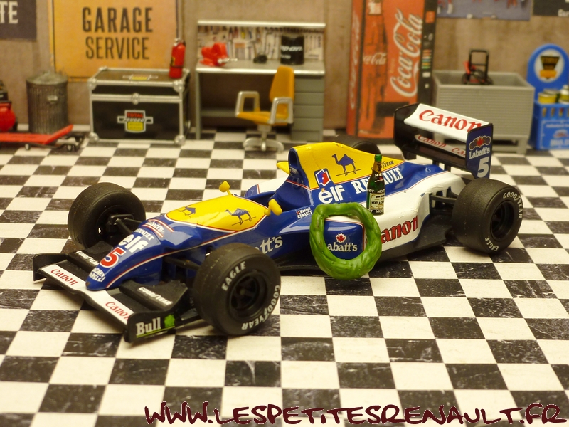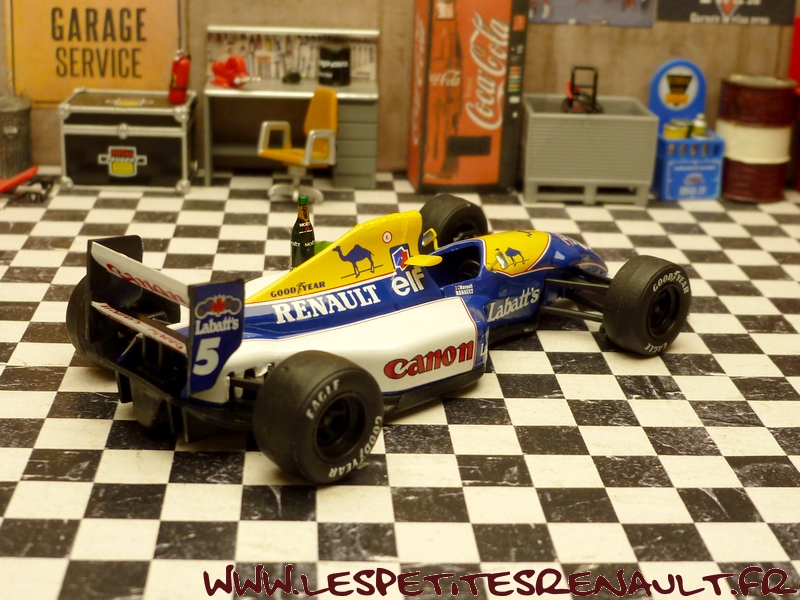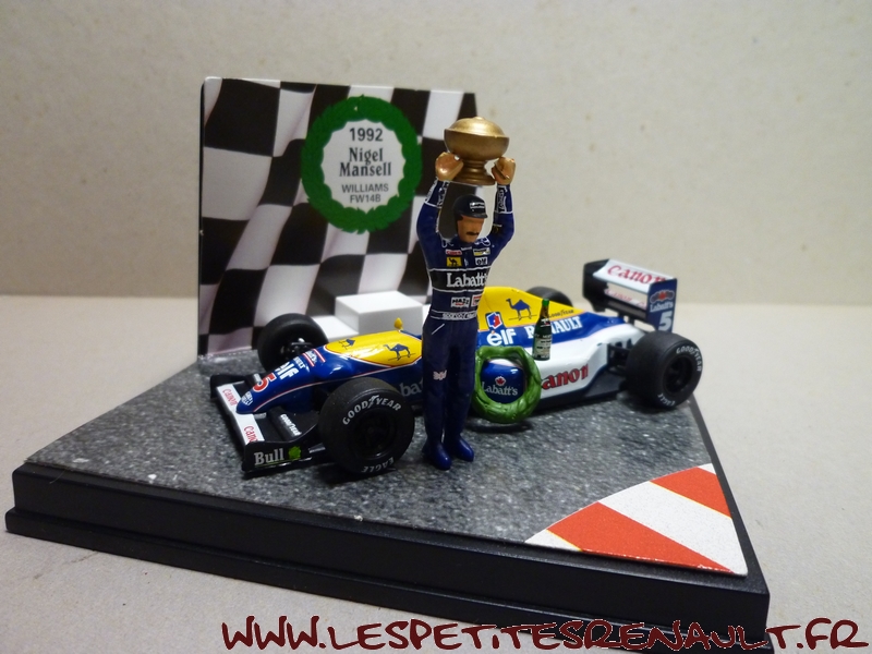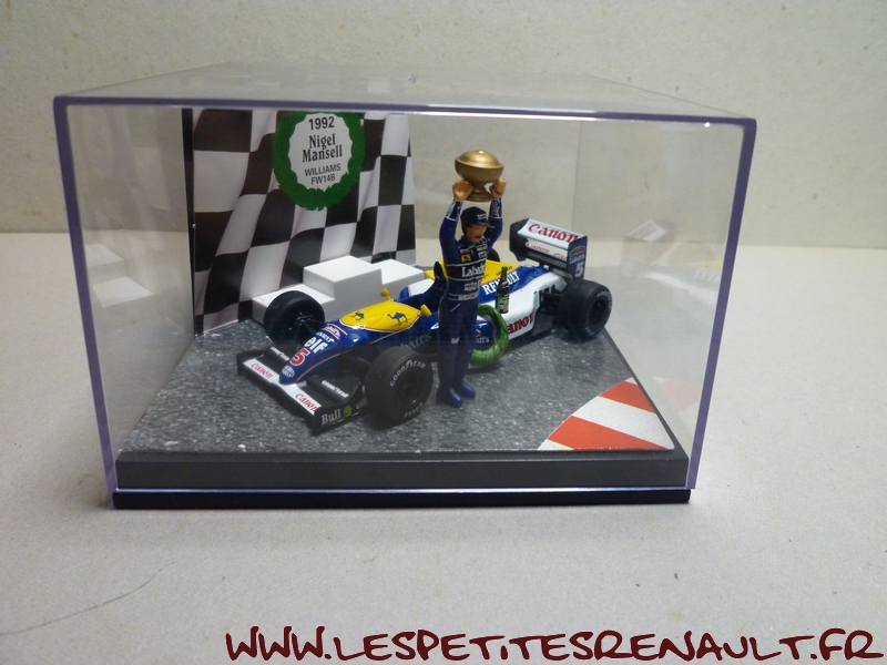 Modèle : Williams Renault FW14 B Année : 1992 Course : GP d'Australie Pilote : #5 - Nigel Mansell Couleur : Bleue jaune et blanche Echelle : 1/43 Fabricant : Quartzo Référence : QWC99012 Collection : Non Matière : Zamak, châssis plastique Série limitée : 5000 ex. Boitage : Boite cristal 11x11 Commentaires : Version fin de saison avec la victoire de Nigel Mansell en champion du monde des pilotes et Renault en champion du monde des constructeurs. Avec personnage et coupe |