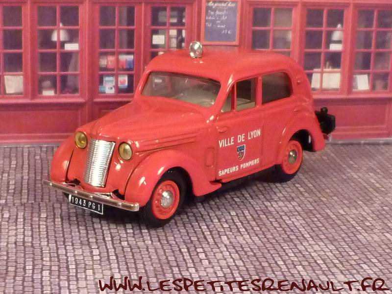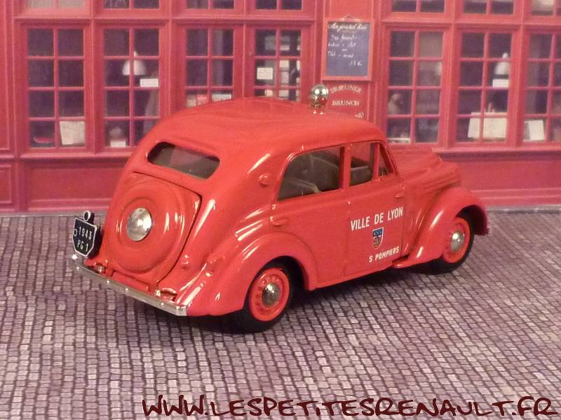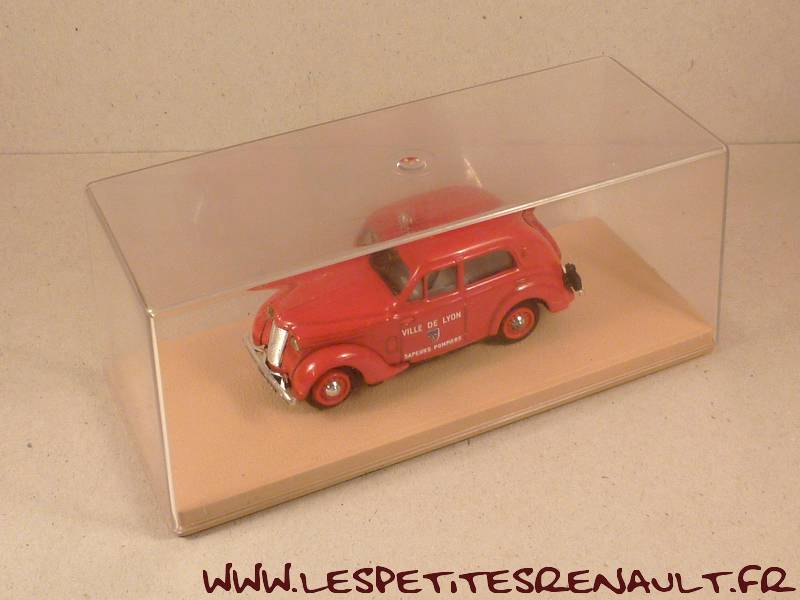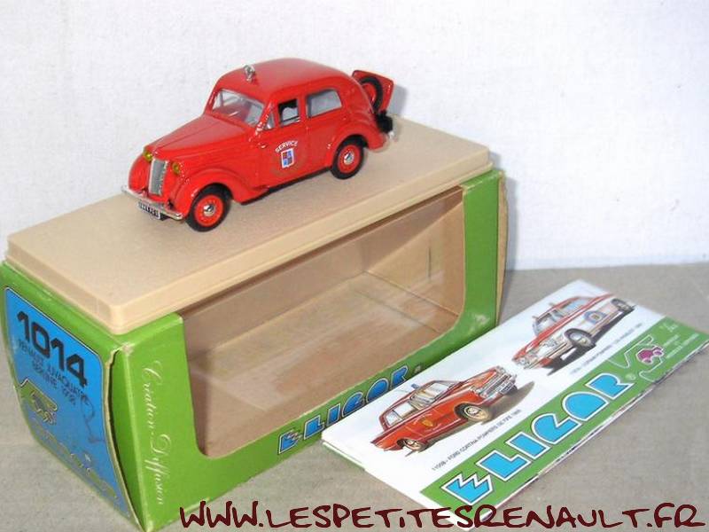 Modèle : Juvaquatre berline Année : 1943 Couleur : rouge Echelle : 1/43 Fabricant : Eligor Référence : 1014P Collection : Non Matière : Zamak, châssis plastique Série limitée : Non Boitage : Boite cristal 6x15, surboite carton Commentaires : Juvaquatre type BFK3. Indiquée au catalogue Eligor comme étant un modèle 1938, mais le coffre ouvrant n'est apparu qu'en 1940, et la plaque porte l'année 1943. Décoration aux couleurs des Sapeurs Pompiers de la ville de Lyon. Moule issu de l'outillage Norev. |