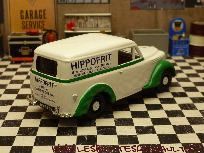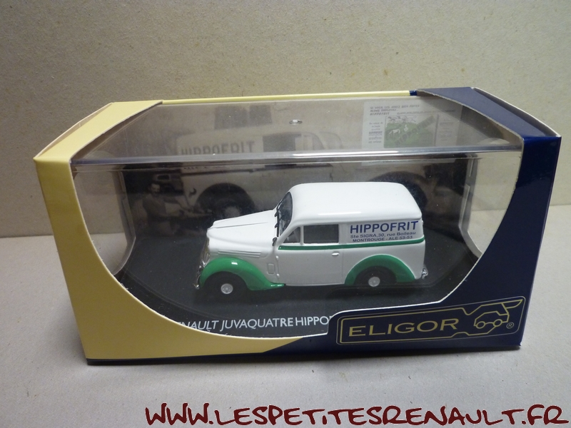 Modèle : Dauphinoise tôlée Année : 1956 Couleur : Blanche et verte Echelle : 1/43 Fabricant : Eligor Référence : 101166 Collection : Non Matière : Zamak, châssis plastique Série limitée : Non Boitage : Boite cristal + surboite Commentaires : Décoration aux couleurs des huiles de fritures Hippofrit. L'original est une Juvaquatre mais la caisse utilisée pour la miniature par Eligor est une Dauphinoise. |
