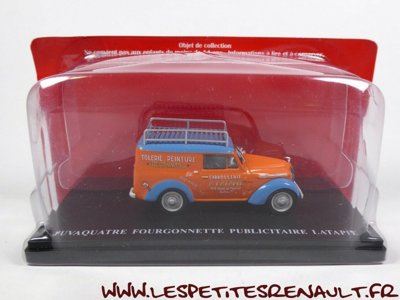 Modèle : Dauphinoise tôlée Année : 1956 Couleur : Orange et bleue Echelle : 1/43 Fabricant : Ixo Référence : 36 Collection : Utilitaires Renault (Hachette) Matière : Zamak, châssis plastique Série limitée : Non Boitage : Socle + blister Commentaires : Décoration aux couleurs de la carrosserie Latapie. L'original est une Juvaquatre mais la caisse utilisée pour la miniature par Ixo est une Dauphinoise. |