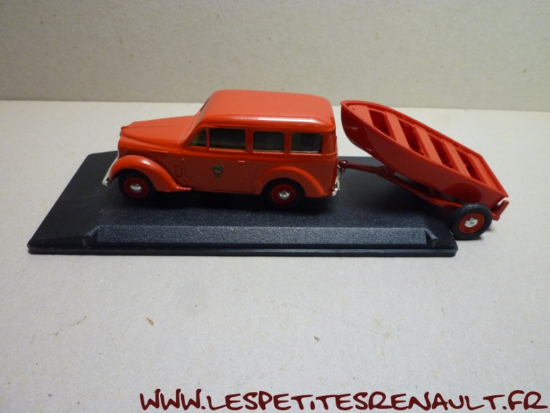 Modèle : Dauphinoise vitrée Année : 1956 Couleur : Rouge Echelle : 1/43 Fabricant : Eligor Référence : 100703 Collection : Non Matière : Zamak, châssis plastique Série limitée : Non Boitage : Boite cristal + surboite Commentaires : Modèle indiqué comme Juvaquatre, mais avec une caisse de Dauphinoise. Décoration aux couleurs des sapeurs pompiers. Livrée avec une remorque, une barque et deux rames. |