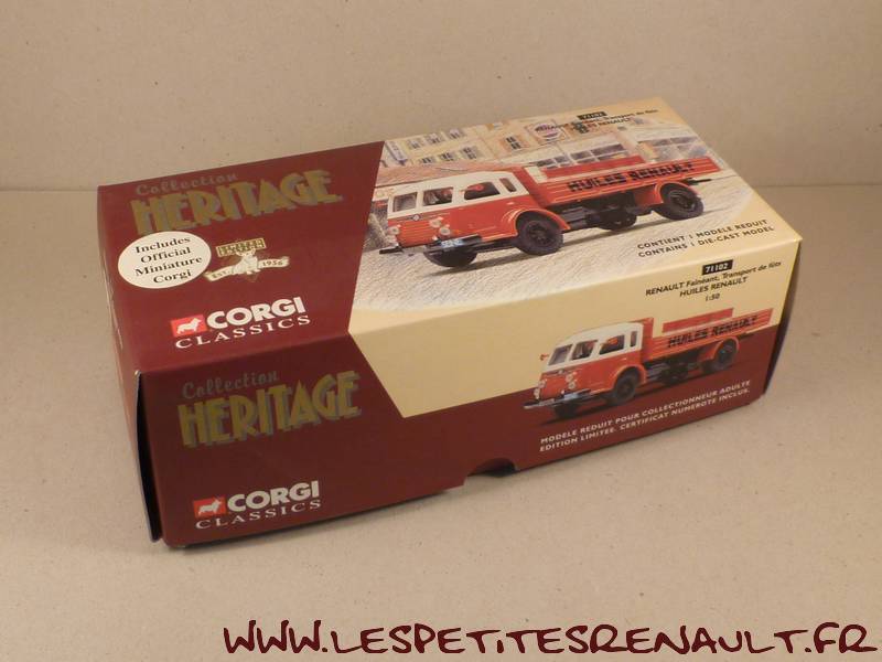 Modèle :Renault Fainéant PlateauAnnée : 1951 Couleur : Blanc et rouge Fabriquant : Corgi Echelle : 1/50 Référence : 71102 Collection : Corgi Héritage Matière : Zamak Série limité : 1638/5000 Boitage : Boite carton Commentaires : Décoration Huiles Renault |